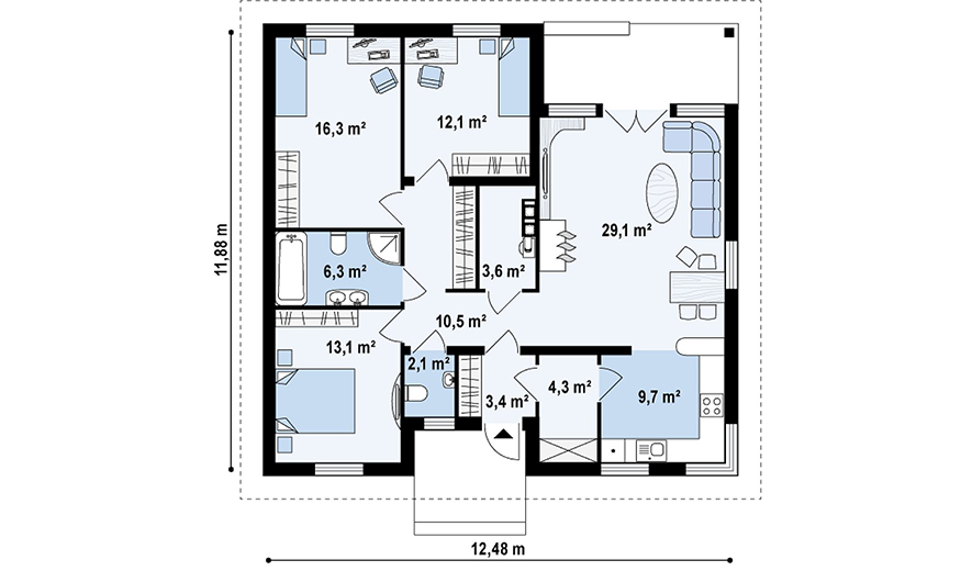 Проект дома 11.88x12.48 метров, общей площадью 110