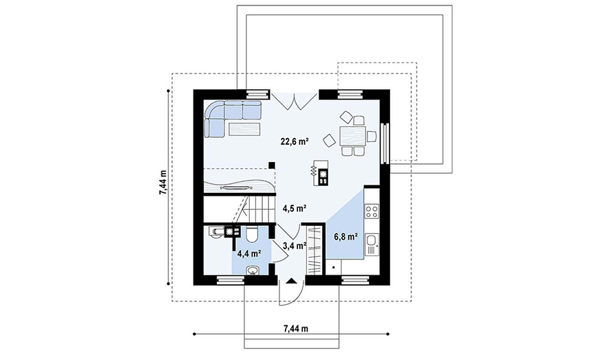 Проект дома 7.44x7.44 метров, общей площадью 80